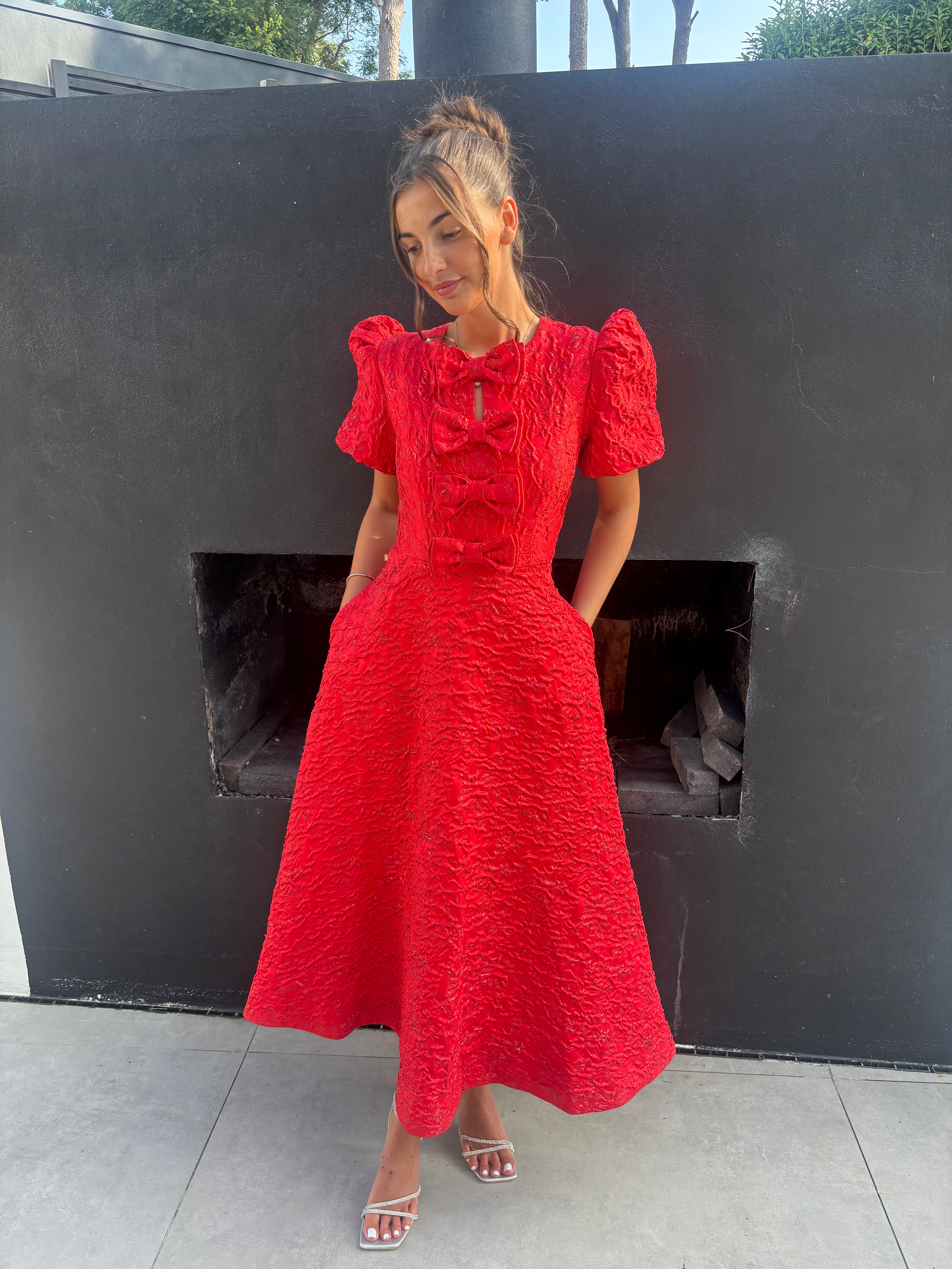 EMMY RED JACQUARD BOW DRESS