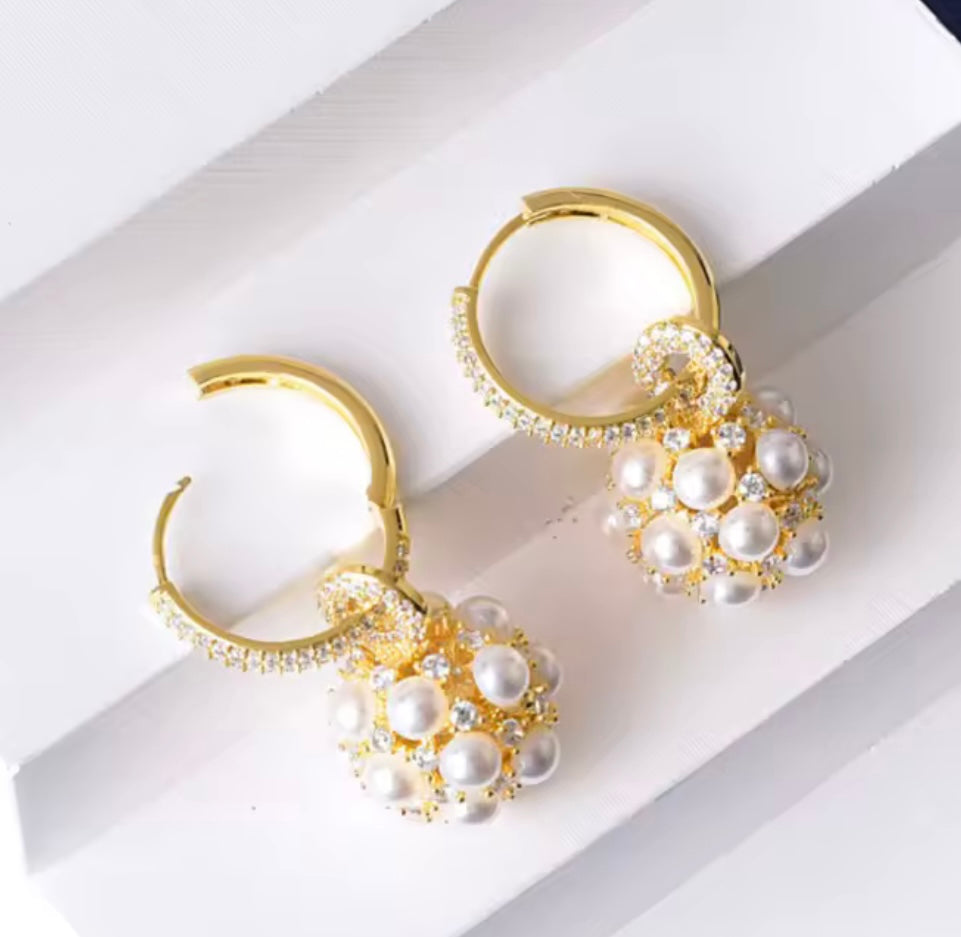 GOLD PEARL BALL DROP EARRINGS WITH DIAMONTE HOOPS