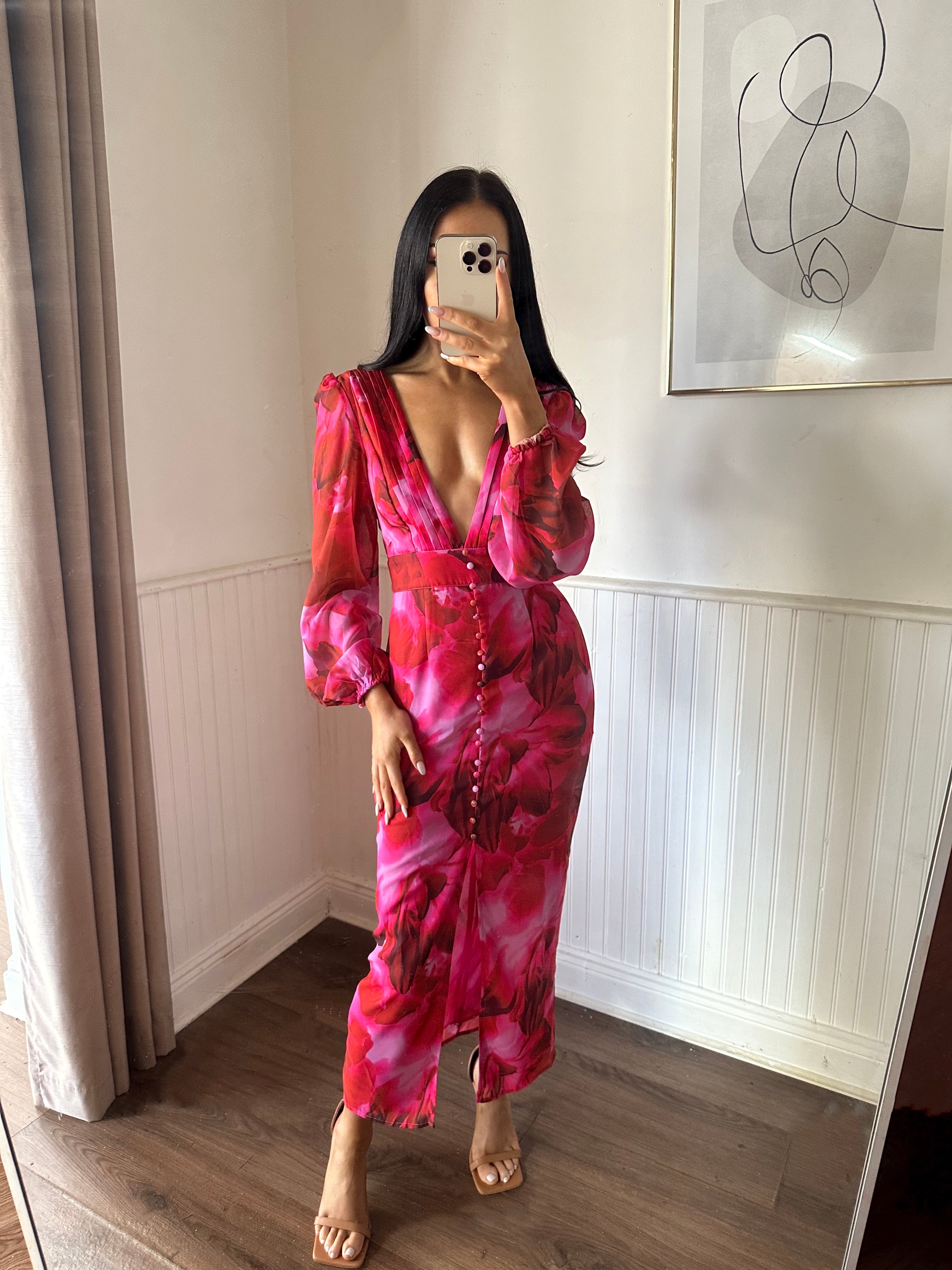 MIMI DRESS RED FLORAL WITH FLARE SLEEVE