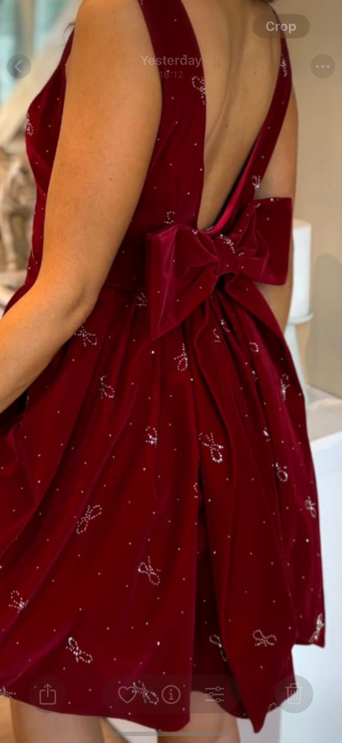 MINI VELVET BURGUNDY DRESS WITH DIAMONTE DETAIL AND BOW BACK