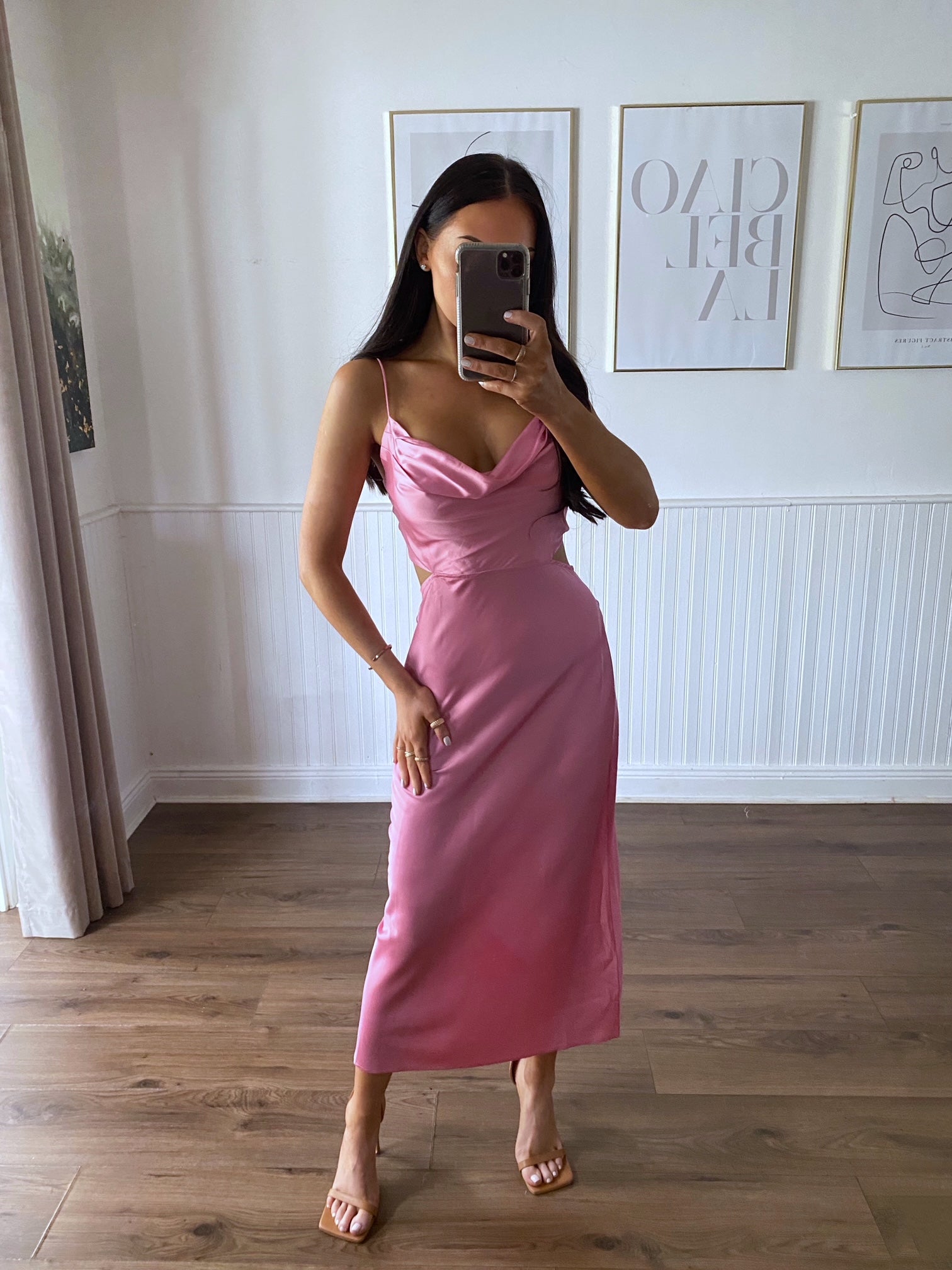 DETAILS Our Charis Slip Dress features a midi length, cowl neckline, halterneck detailing with adjustable ties at the midsection of your back and invisible zipper. This garment has lining and has no stretch. 96% Polyester, 4% Spandex. Please refer to care label for garment care instructions. Colours may appear slightly different to the website due to lighting, computer picture resolution and monitor settings. *Back image there for reference not colour 🙂