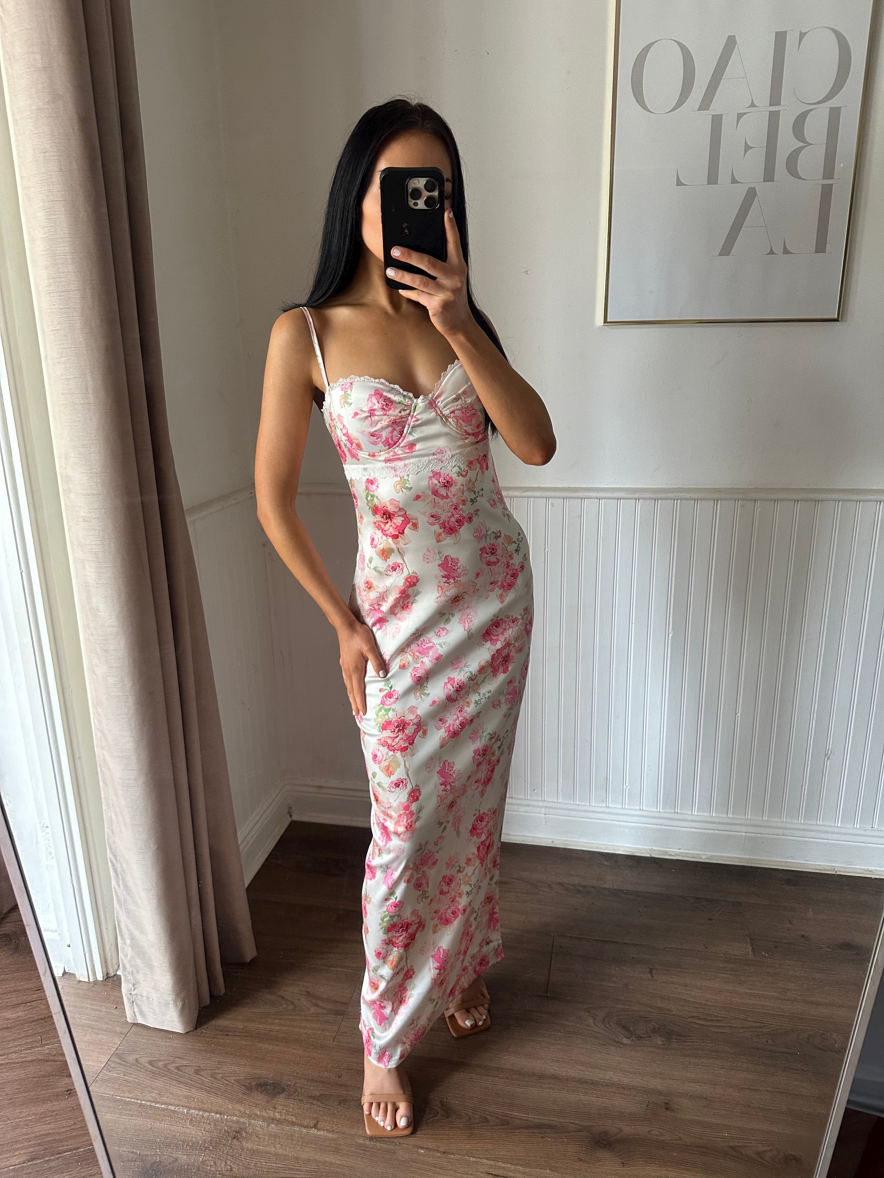 Stunning new floral fitted dress Featuring a built in cup lace lined bodiceΒ Back slit for easy walking!!Β