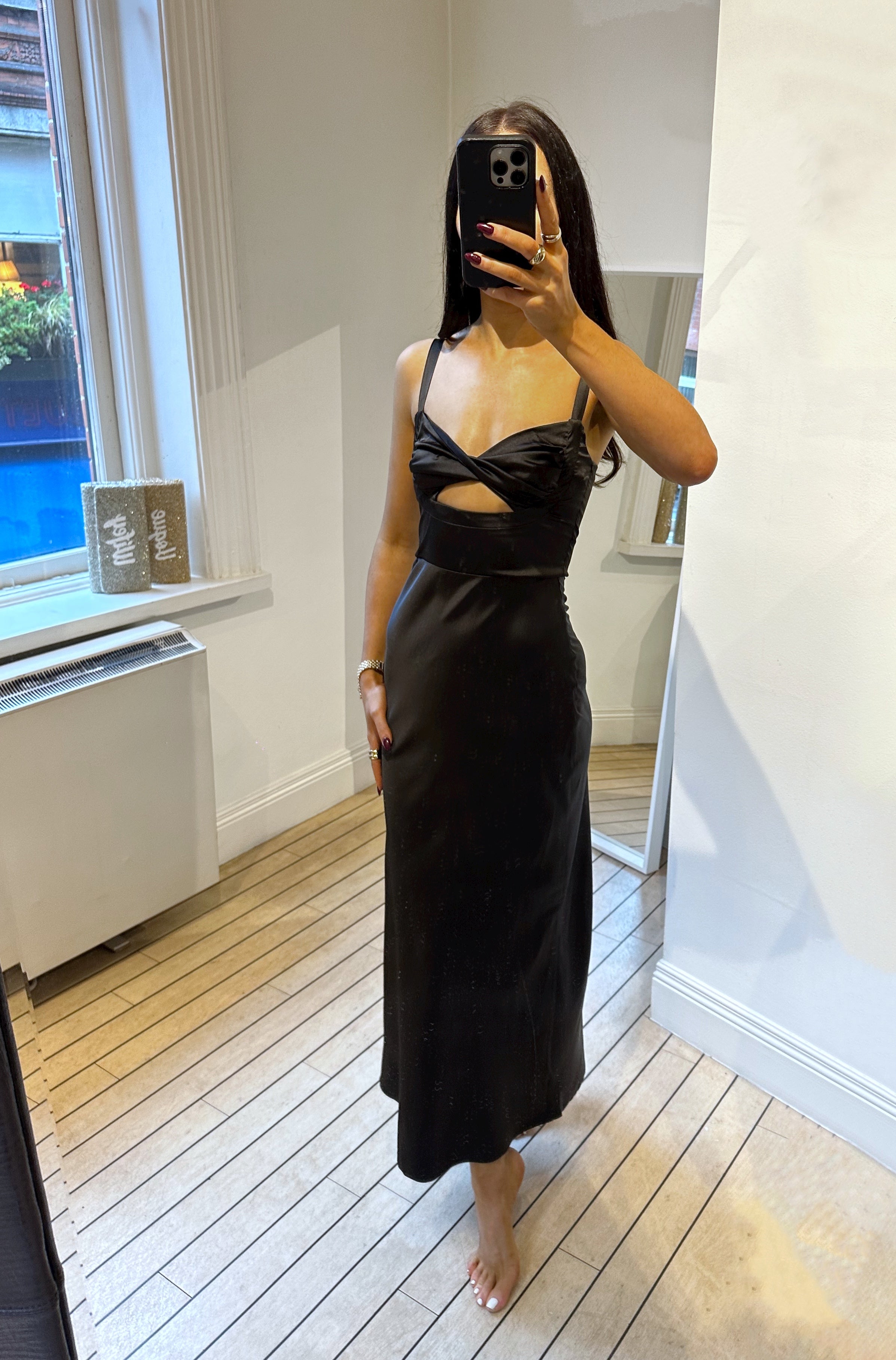Our Kelsi Midi Dress features a midi length, twisted bust, adjustable spaghetti straps and invisible centre back zipper. Lining in the bodice and no stretch throughout the garment. *Please note model is wearing a small and is a UK 8 . There is a stretch in the fabric. 97% Polyester 3% Spandex. Please refer to care label for garment care instructions.