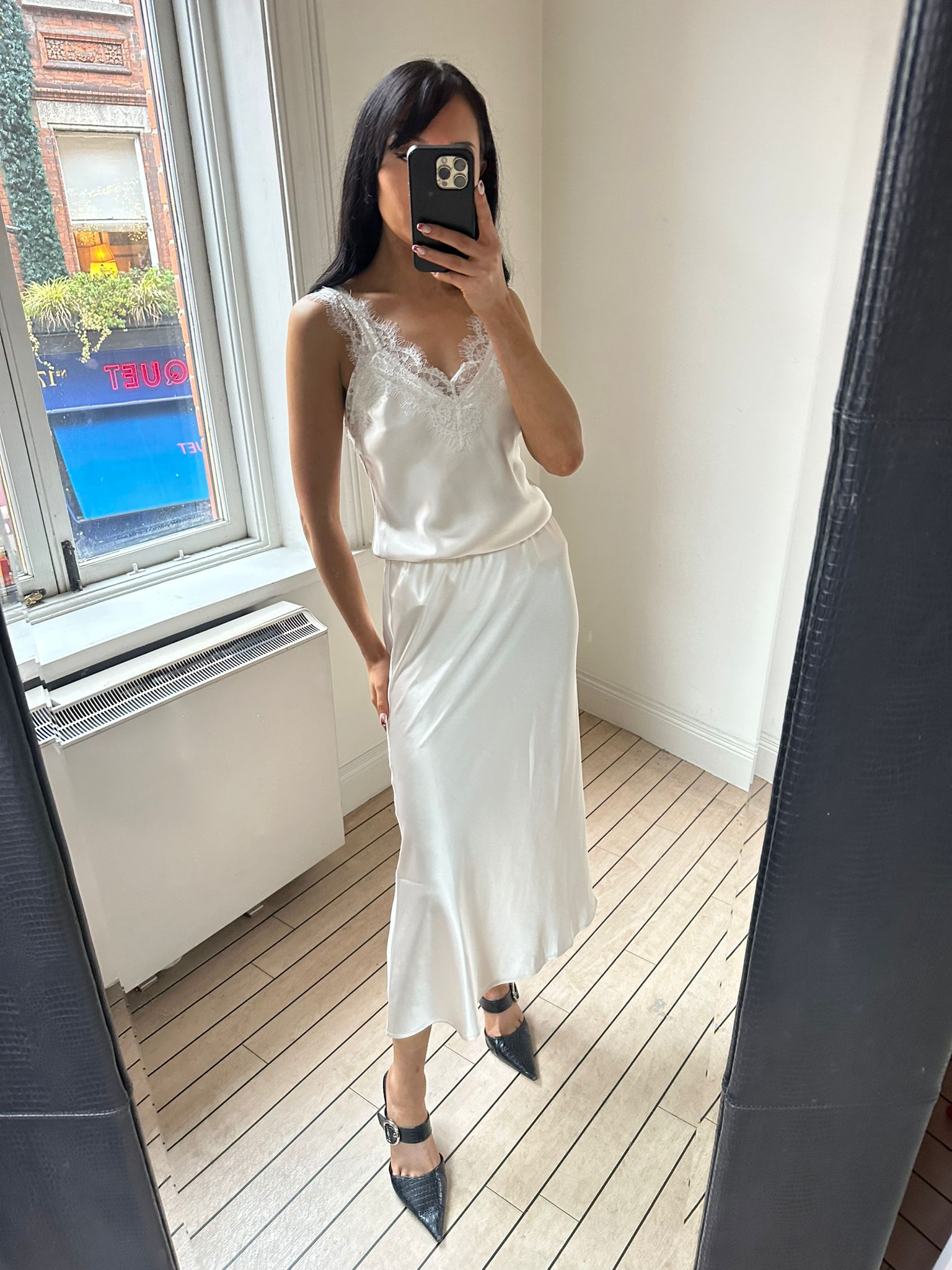We are super excited to launch our satin cami and skirt collection! Made from a high grade of satin with lace trim, these tops will become your best wardrobe friend! Dress up/ dress down, layer under cardigans you will get so much wear from these tops! Model is a UK 6 and is wear XS. These tops are true sizing – if between sizes we recommend to size up Complete the look with one of our stain skirts 🙂